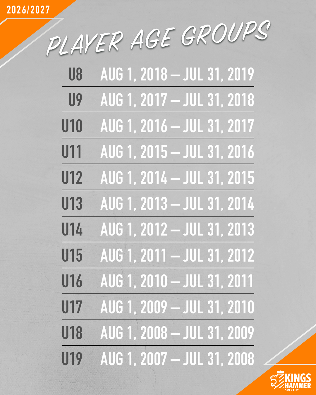 With the upcoming age group changes taking effect, we are aligning our player pathway to ensure a seamless transition and continued development for all athletes. (Click here to view the 2026/2027 Age Groupings.)
